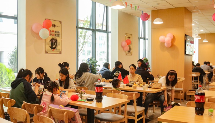 干部職工和家屬們團(tuán)聚在一起就餐。周田 攝