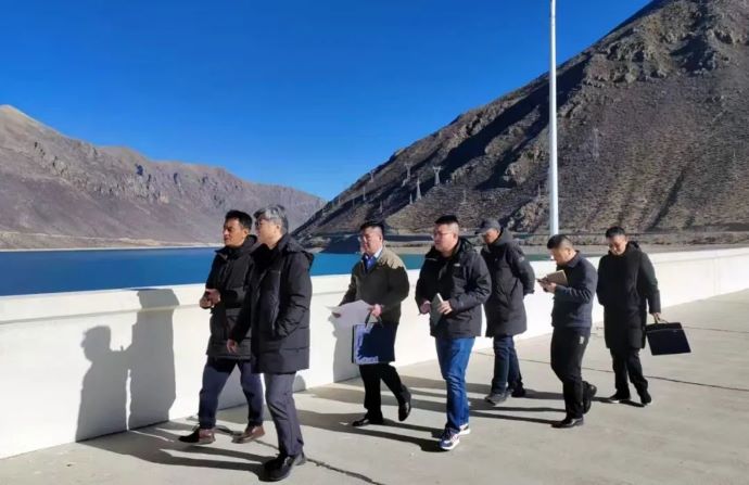 劉剛(左二)檢查旁多水利樞紐大壩。