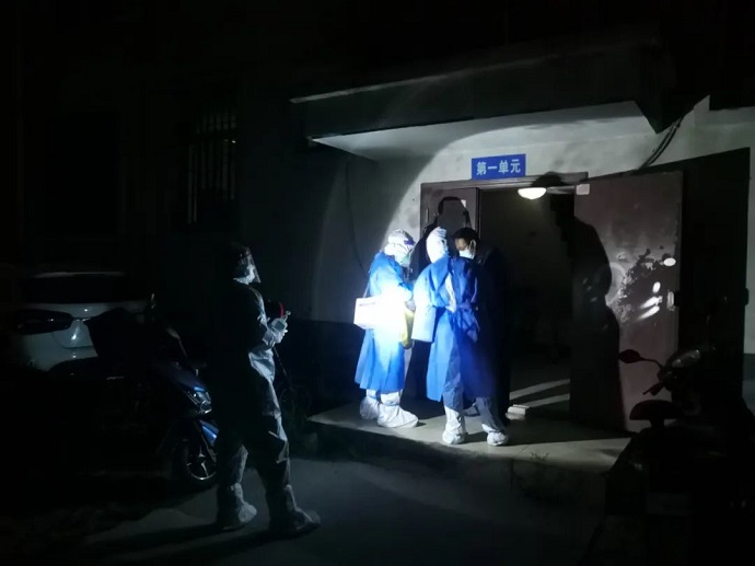 在做好防護準備后,扯起嗓門開始耐心的給即將入睡的百姓做起動員。在疫情期間,經歷了漫長的等待,蝸居在家的市民大多習慣了早晚無序的核酸檢測,但還有不少以身體不適、經不起“磨煉”等理由進行躲避、抗拒,隊員們不厭其煩,只能冒著風險逐戶登門做思想工作。舉燈踱步、排門逐戶做完檢測一眨眼三個多小時過去了,再做好試管封裝,數據統計、校對后已至子夜后半段,深秋微涼的晚風已被隊員的熱情牢牢抵御在防護服之外。