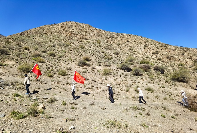 此次踏勘全程22公里,海拔垂直高度1200米。9時30分,新能源公司踏勘人員肩抗黨旗、國旗,背負測量設備和儀器從山腳沿項目進場道路出發。在徒步上山過程中,天氣炙烤灼人,大家三五隨群,或健步直沖或駐足而立,或仔細測量或落筆記錄,或討論工作或抒懷暢想。大家互相幫助、互相鼓勁,隨著海拔的不斷攀升,身體負重不斷加大,氣息開始急促、腳步不再有力,每前進一步都特別的困難,但眼前的大山壯闊雄渾,遠處的冰川雪景圣潔空靈,頭頂的天空湛藍纖塵不染,讓大家心曠神怡,真切感受到高度是一種境界,攀登是一種追求,是一種“小天下”的胸懷和氣魄!