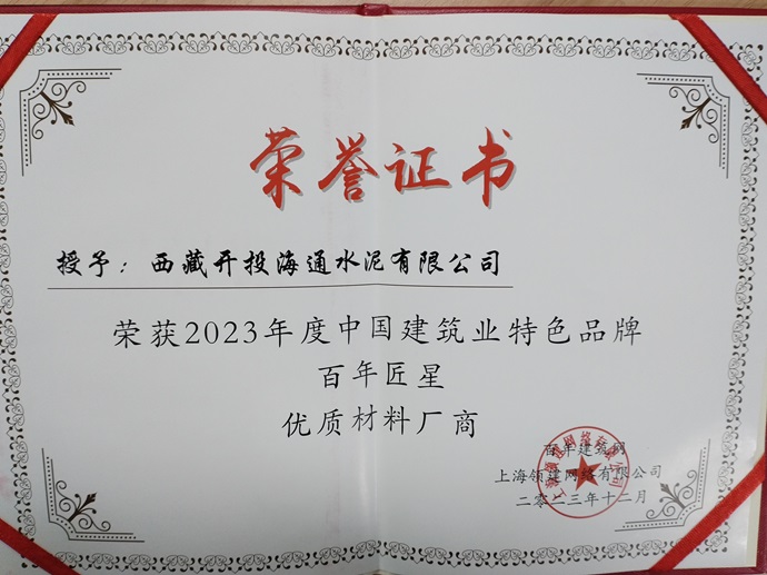 近日,西藏開投海通水泥有限公司榮獲2023年度中國建筑業(yè)特色品牌百年匠星優(yōu)質材料廠商榮譽稱號。