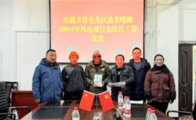11月28日、12月2日,西藏開投那曲河水電公司組織舉行色尼區(qū)曲果嘎姆200MW風電項目農牧民工資發(fā)放儀式,為羅瑪鎮(zhèn)、香茂鄉(xiāng)5個村共計338人發(fā)放工資129.96萬元。