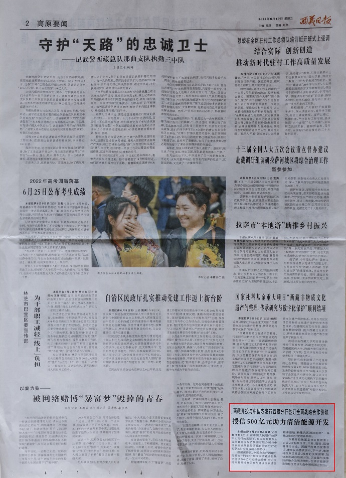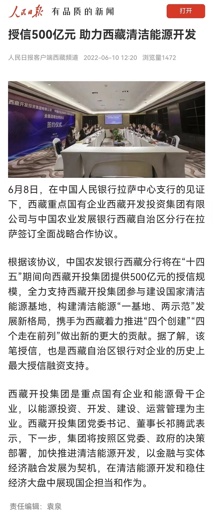 (編者按)6月10日,《人民日報(bào)》客戶端西藏頻道報(bào)道了《授信500億元 助力西藏清潔能源開發(fā)》。《西藏日報(bào)》2022年6月10日在第2版“高原要聞”欄目刊登文章,報(bào)道《授信500億元|西藏開投集團(tuán)與中國農(nóng)發(fā)行西藏分行簽訂全面戰(zhàn)略合作協(xié)議》。西藏電視臺2022年6月10日在西藏電視臺影視文化頻道《今晚九點(diǎn)》欄目報(bào)道了《授信500億元|西藏開投集團(tuán)與中國農(nóng)發(fā)行西藏分行簽訂全面戰(zhàn)略合作協(xié)議》,《珠峰云》平臺同步播放。新華網(wǎng)、經(jīng)濟(jì)日報(bào)、西藏衛(wèi)視、西藏日報(bào)客戶端、網(wǎng)信西藏、今日頭條等媒體均報(bào)道了相關(guān)新聞。全文如下: