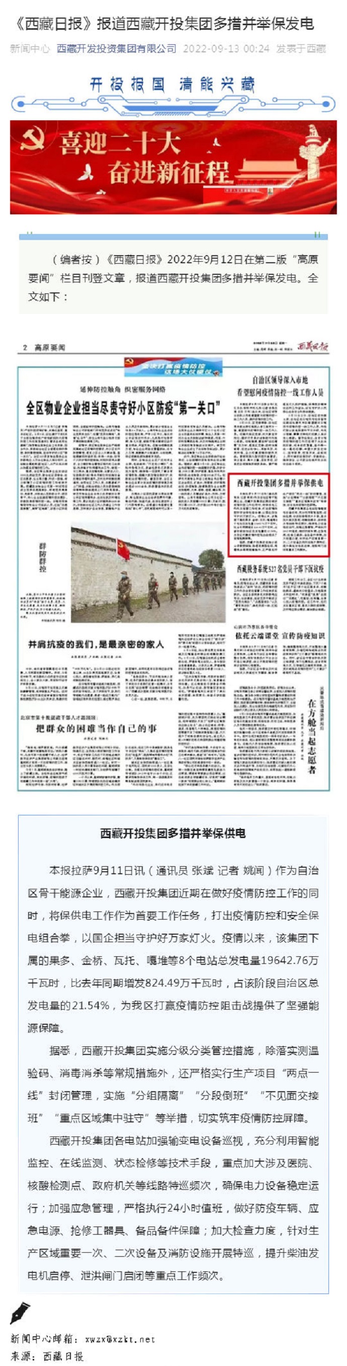 【西藏日報】報道西藏開投集團多措并舉保發(fā)電