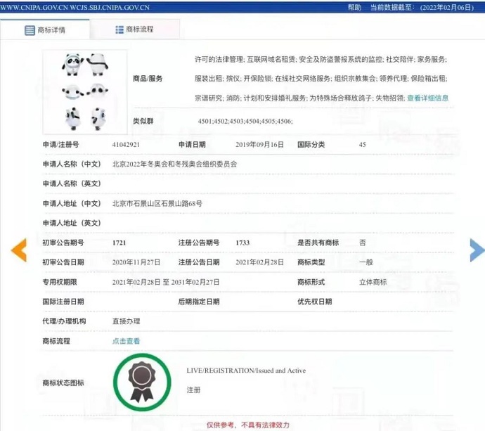 北京冬奧就中英文名稱“冰墩墩”“Bing Dwen Dwen”及其三維標(biāo)志在全部45個類別的商標(biāo)于2020年獲準(zhǔn)注冊。