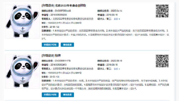 2019年9月,北京冬奧組委向國家知識產(chǎn)權(quán)局提交了4件與冰墩墩相關(guān)的外觀設(shè)計專利,并于2020年獲得授權(quán)。