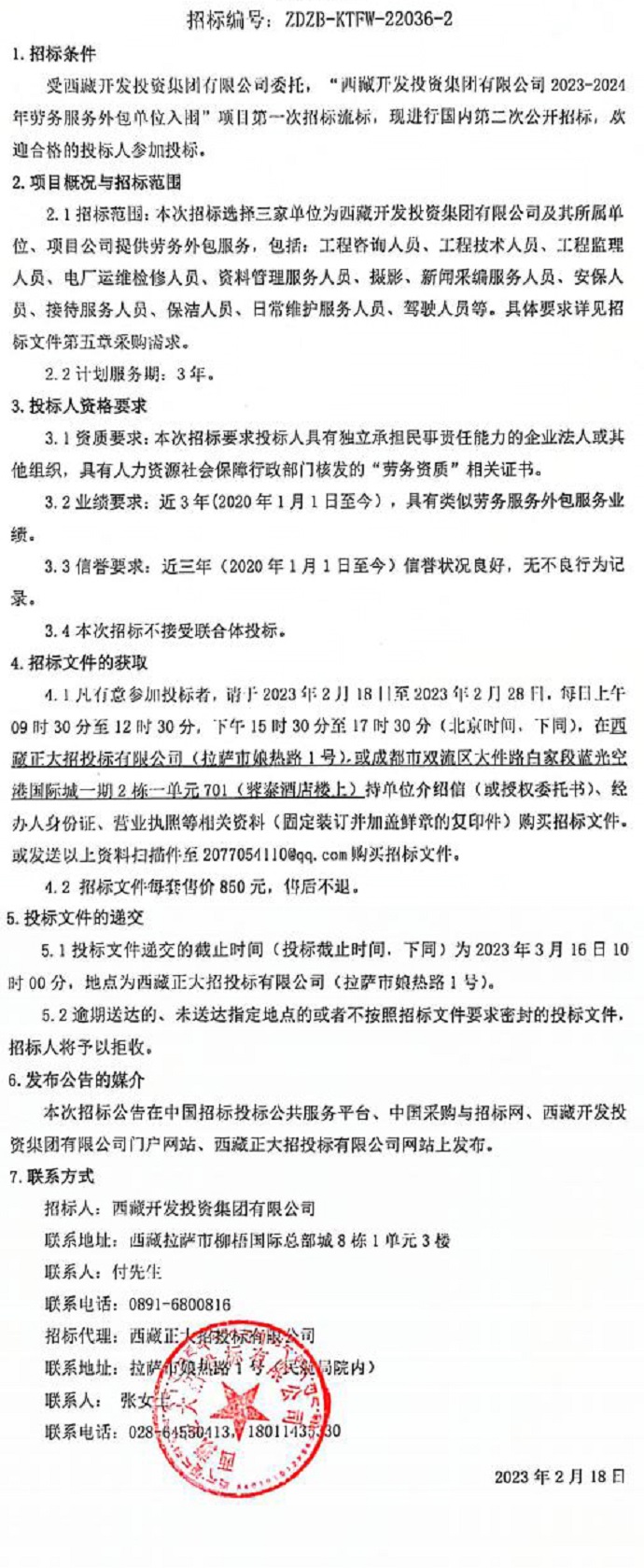 西藏開發投資集團有限公司2023-2024年勞務服務外包單位入圍招標公告