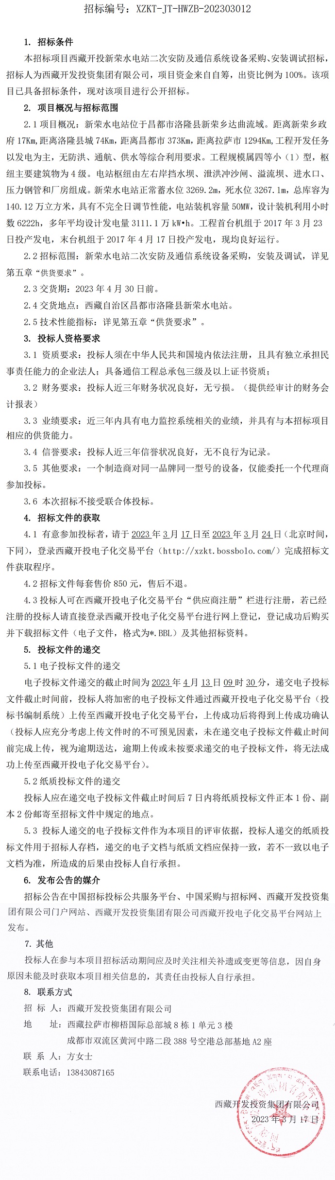 西藏開投新榮水電站二次安防及通信系統設備采購、