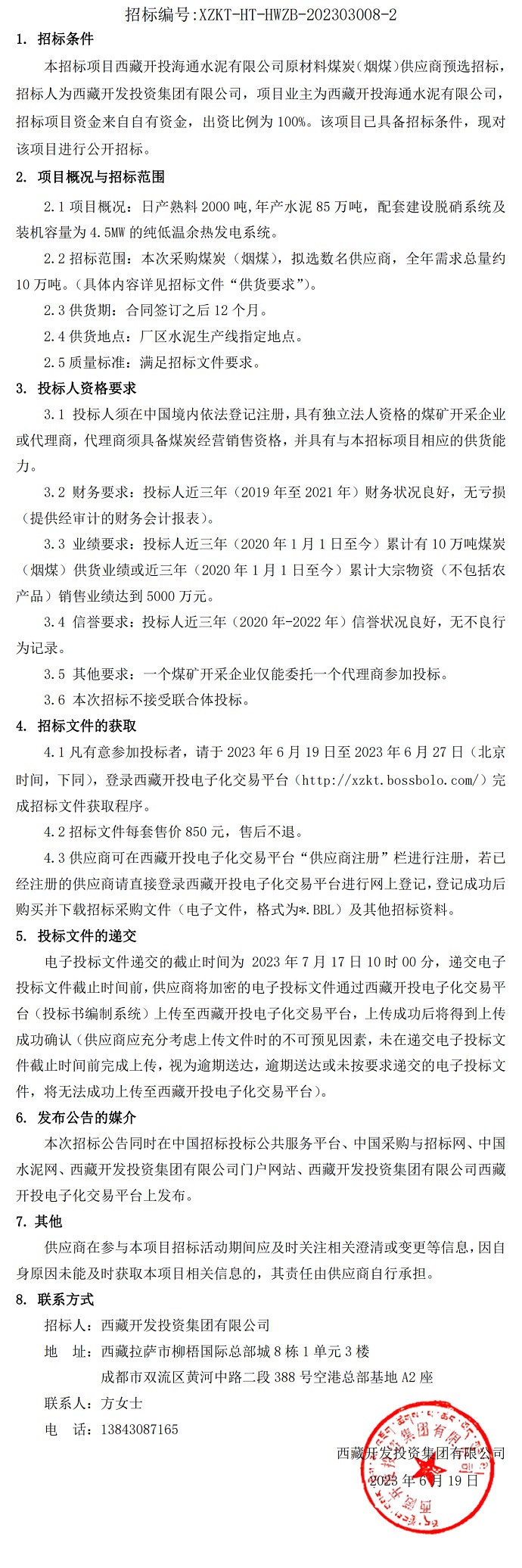 西藏開投海通水泥有限公司原材料煤炭(煙煤)供應商預選招標公告(二次)