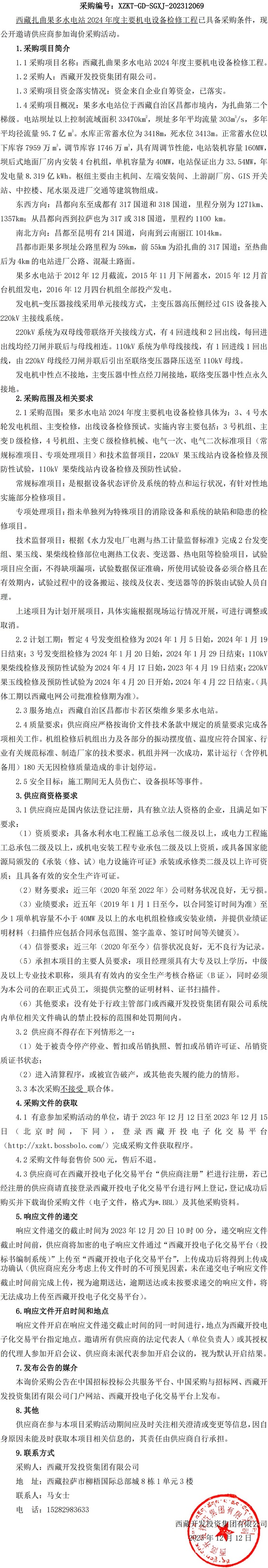 西藏扎曲果多水電站2024年度主要機電設備檢修工程詢價采購公告