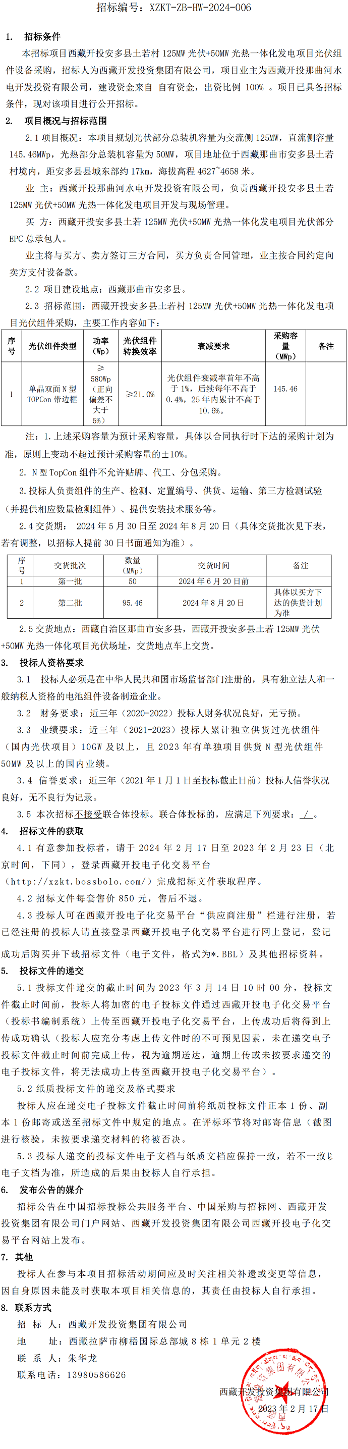 西藏開投安多縣土若村125MW光伏+50MW光熱一體化發電項目光伏組件設備采購招標公告