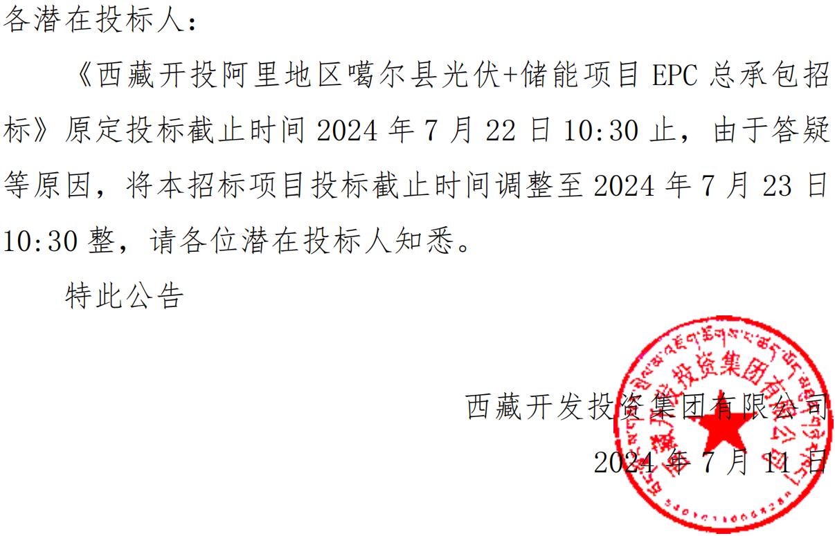 關(guān)于延長《西藏開投阿里地區(qū)噶爾縣光伏+儲 能項(xiàng)目 EPC 總承包招標(biāo)》投標(biāo)截止時(shí)間的公告