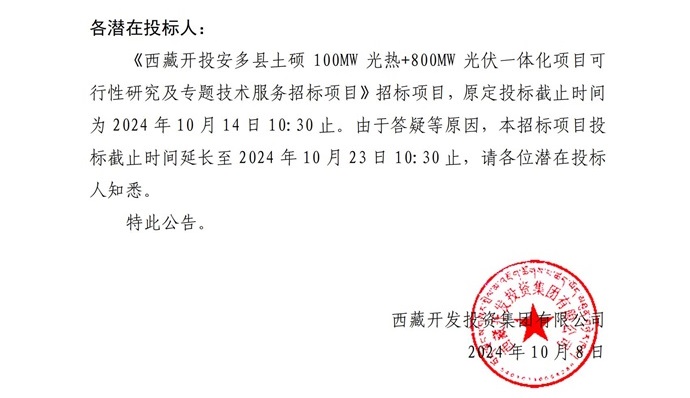 關(guān)于延長(zhǎng)《西藏開投安多縣土碩100MW光熱+800MW光伏一體化項(xiàng)目可行性研究及專題技術(shù)服務(wù)招標(biāo)項(xiàng)目》投標(biāo)截止時(shí)間的公告